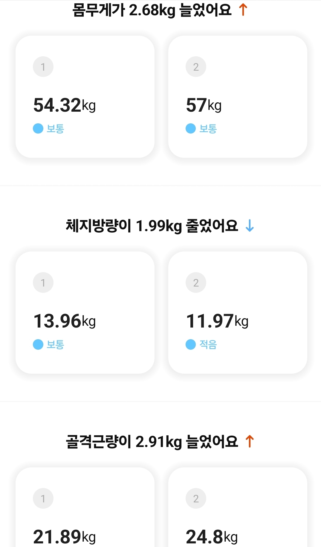 체중이 늘고 체지방이 줄었는데 근육이 좀 많이 늘음.